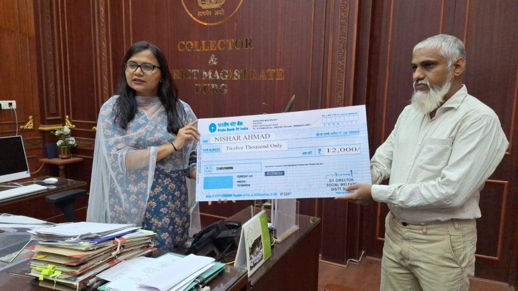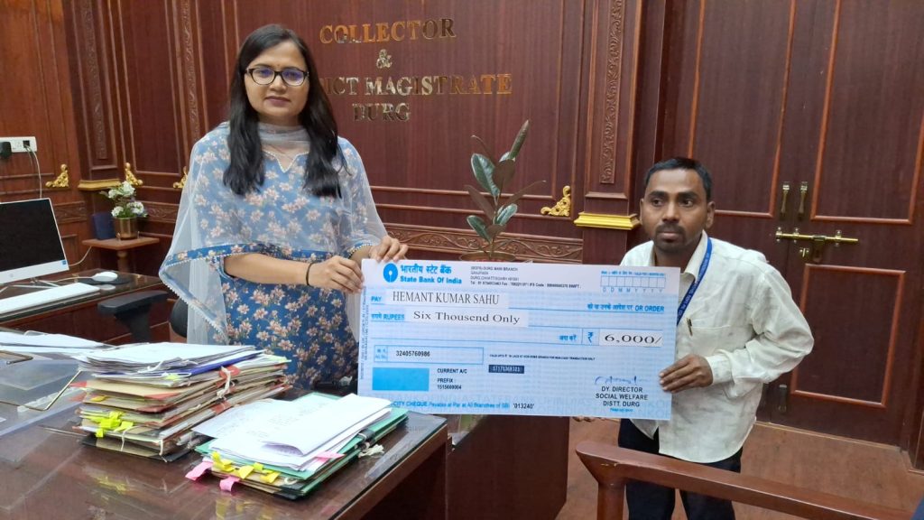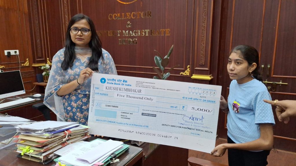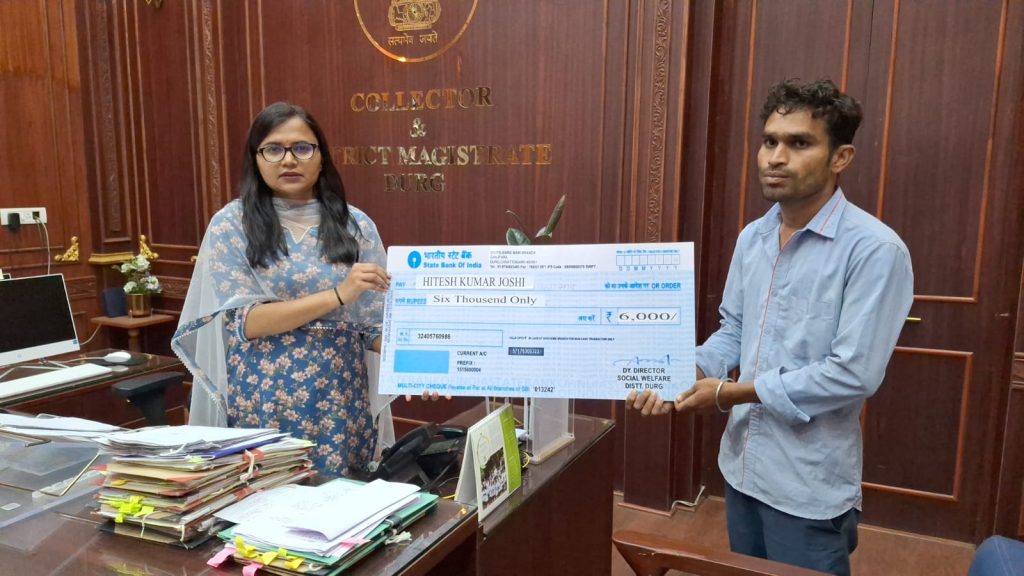 *जिला जनसंपर्क कार्यालय, दुर्ग (छ.ग.)**- छात्रा कु. खुशी कुम्भकार को प्रवीण्य सूची में सर्वोच्च स्थान प्राप्त करने पर दी प्रोत्साहन राशि**- कलेक्टर सुश्री चौधरी ने सौंपी राशि का चेक* दुर्ग, 20 नवम्बर 2024/ कलेक्टर सुश्री ऋचा प्रकाश चौधरी ने समाज कल्याण विभाग द्वारा संचालित योजना क्षितिज अपार संभावनाएं के तहत उच्च शिक्षा में अध्ययनरत् 03 दिव्यांग छात्र क्रमशः श्री हितेश कुमार जोशी और श्री हेमंत कुमार साहू को 6-6 हजार रूपए तथा श्री निशार अहमद को 12 हजार रूपए उच्च शिक्षा प्रोत्साहन राशि का चेक प्रदान किया। इसी प्रकार 12वीं कक्षा में दिव्यांग श्रेणी में जिले के प्रवीण्य सूची में सर्वोच्च स्थान प्राप्त छात्रा कुमारी खुशी कुम्भकार को 5 हजार रूपए राशि का चेक प्रदान किया। इस अवसर पर समाज कल्याण विभाग के उपसंचालक श्री अमित परिहार एवं विभाग के कर्मचारी उपस्थित थे।