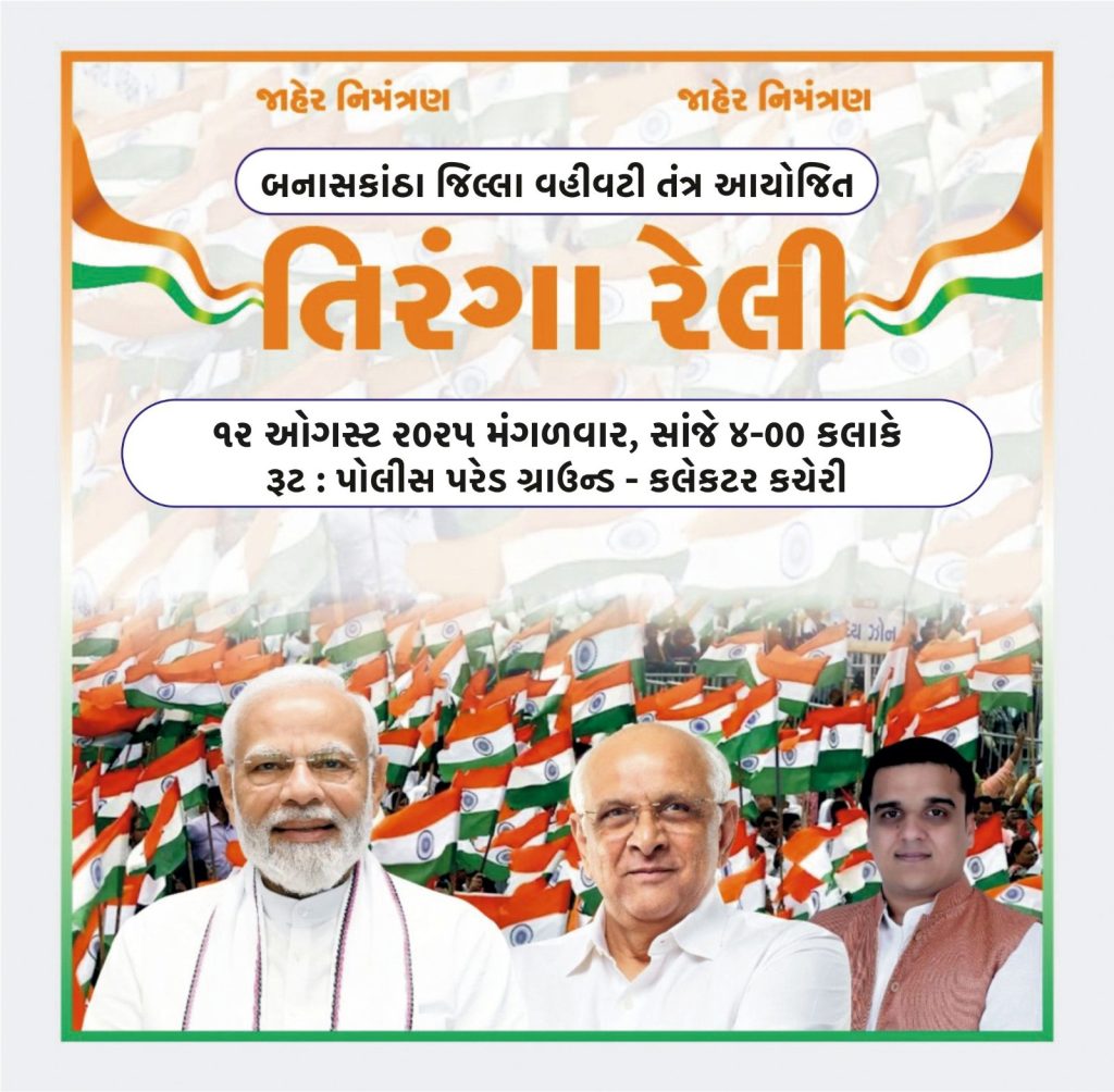 बनासकांठा ज़िले में 12 अगस्त, 2025 को शाम 4 बजे पालनपुर में एक ज़िला स्तरीय तिरंगा यात्रा रैली का आयोजन किया जाएगा। यह तिरंगा यात्रा रैली पुलिस मुख्यालय, पालनपुर से कलेक्टर कार्यालय, पालनपुर तक निकाली जाएगी। ज़िले के अधिकारी, कर्मचारी और पदाधिकारी इस तिरंगा यात्रा में शामिल होंगे। प्रशासन ने सभी नागरिकों से राष्ट्रीय ध्वज के प्रति अपना प्रेम प्रदर्शित करने के लिए इस तिरंगा यात्रा में स्वेच्छा से भाग लेने का आह्वान किया है…